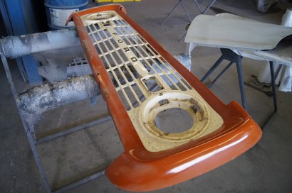 フロントマスクのスムージングを行っています。当ガレージではペイントのクオリティにこだわり、この状態まで下地処理を行ってからペイントするよう塗装工場に注文しているのです。