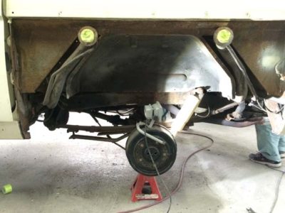 • ルーフを取り外し、無事に塗装ブースへと収まった1971 Bronco Sportです。