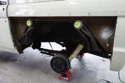 • この後インナーフェンダーとリアフェンダーを溶接で接着し、ボディパネル間の隙間も埋める作業を行います。さらに、ボディの他部もペイントに備えて下地作りを進めています。
