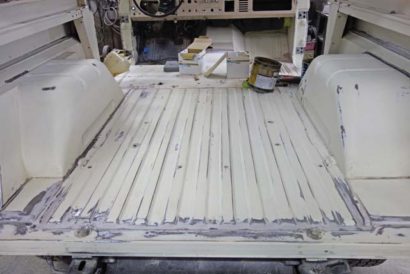 • 日本到着後、早速Restoreプロジェクトを開始しました。まずは、リアフェンダーを中心としたボディのリファインを行うべく、日本到着後にボディショップへとBroncoを持ち込みました。すでに各所パネルが剥がされている状態です。全体的にボディ表面を整えて、オリジナルカラーのWimbledon Whiteへとリペイントします。