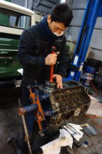 • 各部クリーニングの終わったシリンダーブロックに、クランクシャフトを戻す準備中です。