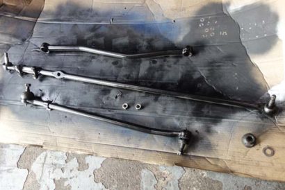 弦巻にてクリーニング&メンテナンスが終了し、工場へと運んだパーツ群。ラジアスアーム、ステアリングのリンク類、アクスルシャフトなどです。