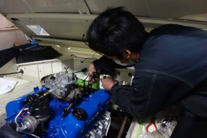 室内と平行してエンジンルームの作業も進めています。オーバーホール済みのキャブレターがエンジンに装着されました。