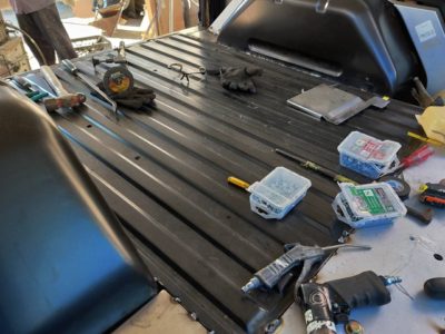 リアフロア貼り替え作業中の1973 Bronco Ranger (Midnight Blue)号です。Newリアフロアが仮留めされました。