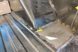 フロントフロアもNewパーツが仮留めされています。ドライバーサイドのフロアパンは撤去されました。この後、フロアパンサポートブレースも交換され、Newフロアパンがインストールされます。