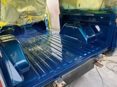 インテリアのペイント作業を終えた1973 Bronco Ranger (Midnight Blue)号は、休む間もなくオリジナルペイントを保護するためのクリアコート塗布作業へと移行しました。より確実な保護膜を作るためフラットクリアを塗布した後、クリアコートを塗布していきます。