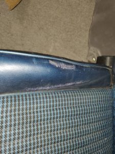スキン自体の経年劣化が数ヵ所、見受けられるため、座面とバックレストの格子柄部分の生地はオリジナルの物を維持しつつ、バイナル生地部分のみ貼り替えることになりました。