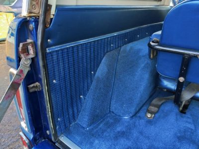 インテリアのリファイン作業中の1973 Bronco Ranger (Midnight Blue)号、Newカーペットが敷設され、オリジナルのベンチシートがクリーニングされインストールされた後、