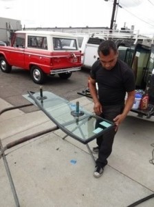 飛び石によるひび割れが見つかったため、ウィンドシールドの交換作業を行ないました。こちらは古いウィンドシールドが外された状態です。
