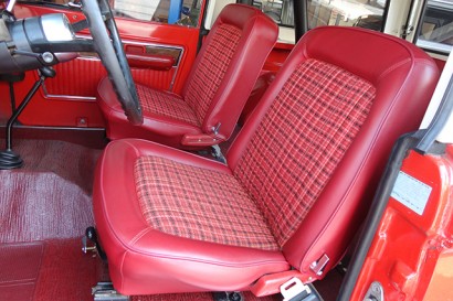 Explorerパッケージ固有のチェック柄シートが特徴的なインテリアもとても綺麗な状態で、今となっては激レアなレッドカラーのビニールフロアカーペットも損傷無く残っています。